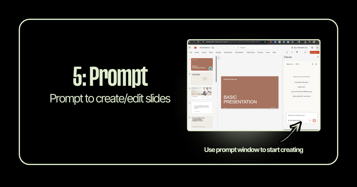 Claude generates the slides directly inside PowerPoint. Not in a separate tool. Not as a file you have to import. Right there in your deck.