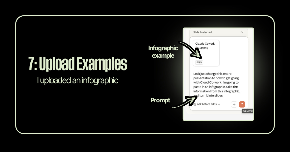 You can upload images, infographics, or reference materials directly into the prompt window. Claude will read them and turn the content into slides.
