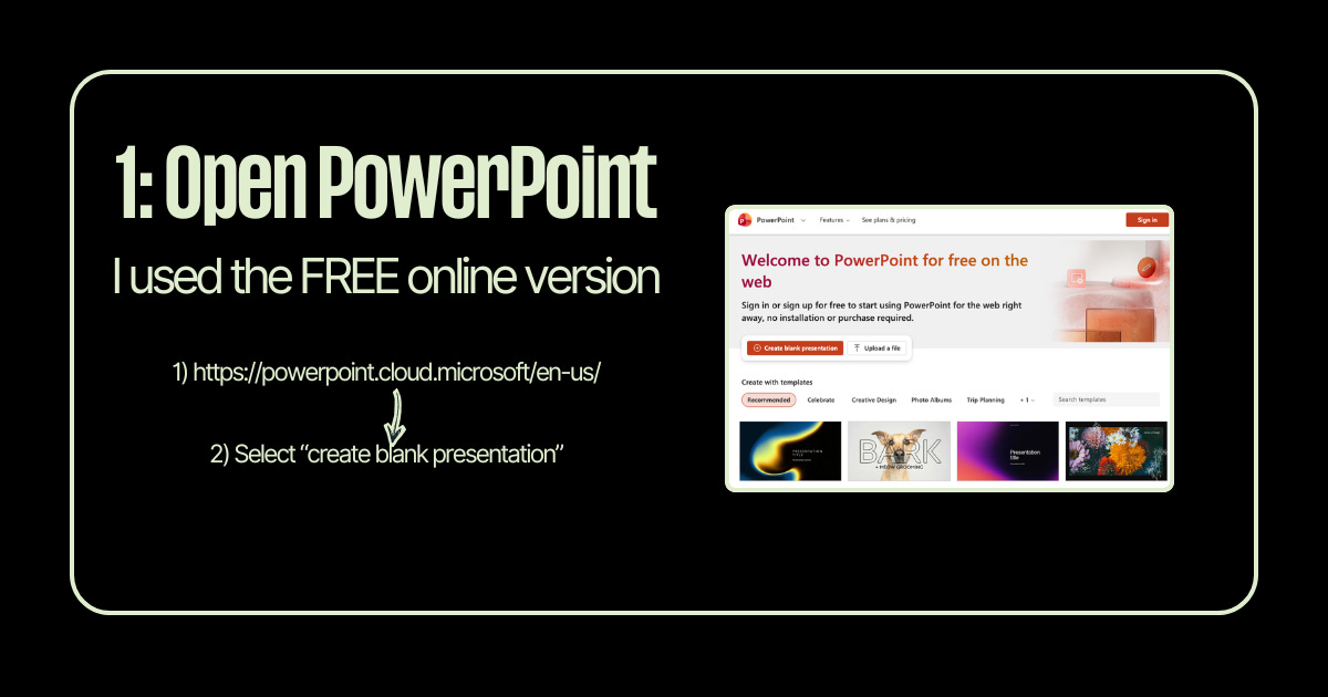 I used the free online version of PowerPoint at powerpoint.cloud.microsoft. Sign in with a Microsoft account (also free), and click “Create blank presentation.”
