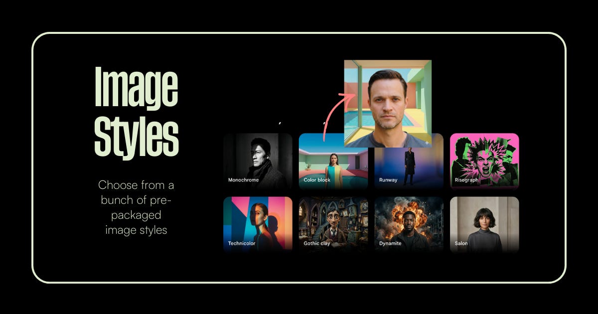 Nano Banana 2 ships with a library of pre-packaged image styles — Monochrome, Color Block, Runway, Risograph, Technicolor, Gothic Clay, Dynamite, Salon. You pick the aesthetic and it applies it to your subject.