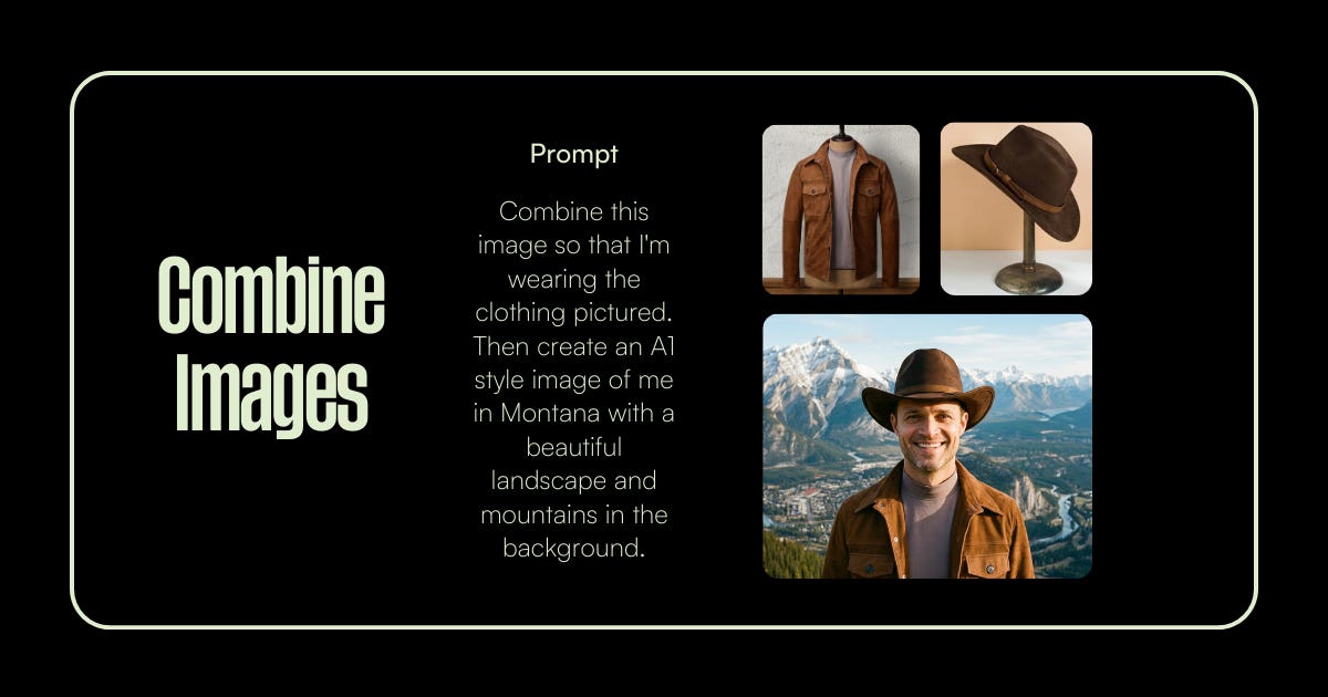 “I’m attaching two images: one photo of me and one photo of [a brown leather jacket + cowboy hat]. Combine them