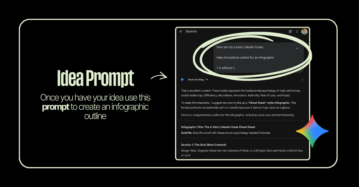 “Here’s my idea about [TOPIC]. Help me build an outline for an infographic.”